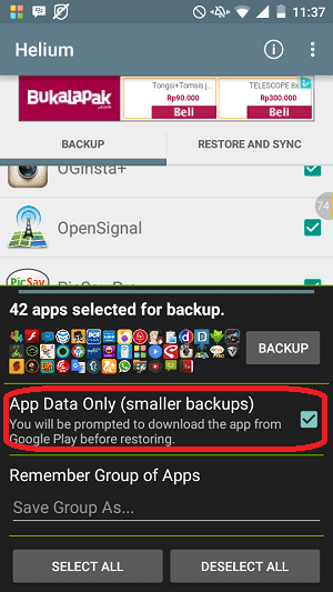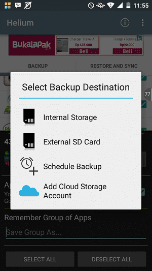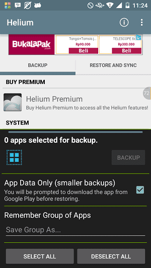 4. Anda dapat mengatur apakah yang akan dibackup oleh Helium adalah datanya saja, atau juga beserta file aplikasinya. Jika hanya datanya saja, Anda akan memiliki file backup dengan ukuran kecil, tapi harus mendownload ulang aplikasinya sebelum restore. Saya sarankan untuk memilih full backup.