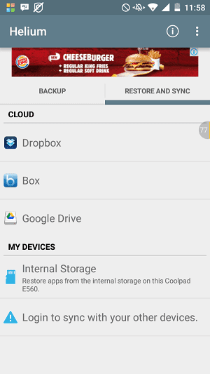 1. Silakan masuk tab Restore and Sync di aplikasi Helium pada Android Anda.