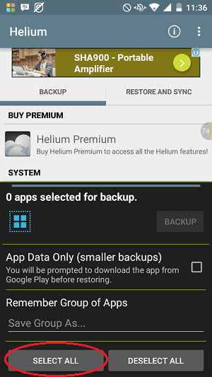 1. Buka aplikasi Helium – App Sync and Backup di Android Anda. Disini Anda akan dihadapkan pada pilihan untuk memilih semuanya, atau Anda juga bisa melakukannya dengan memilihnya secara manual.